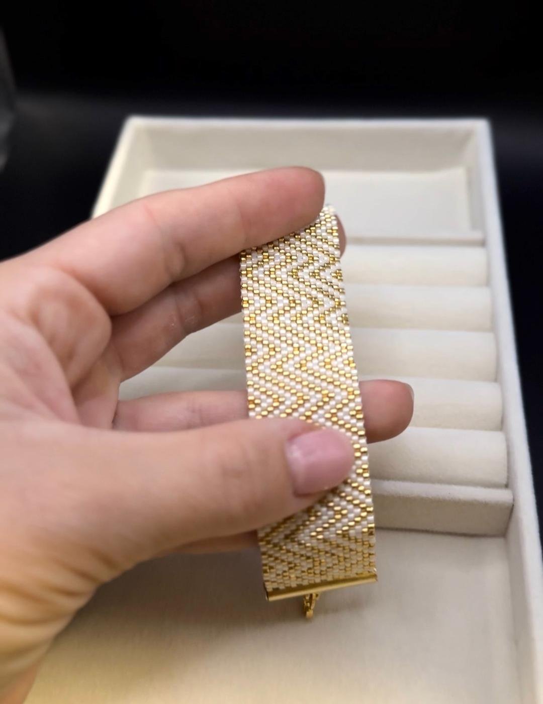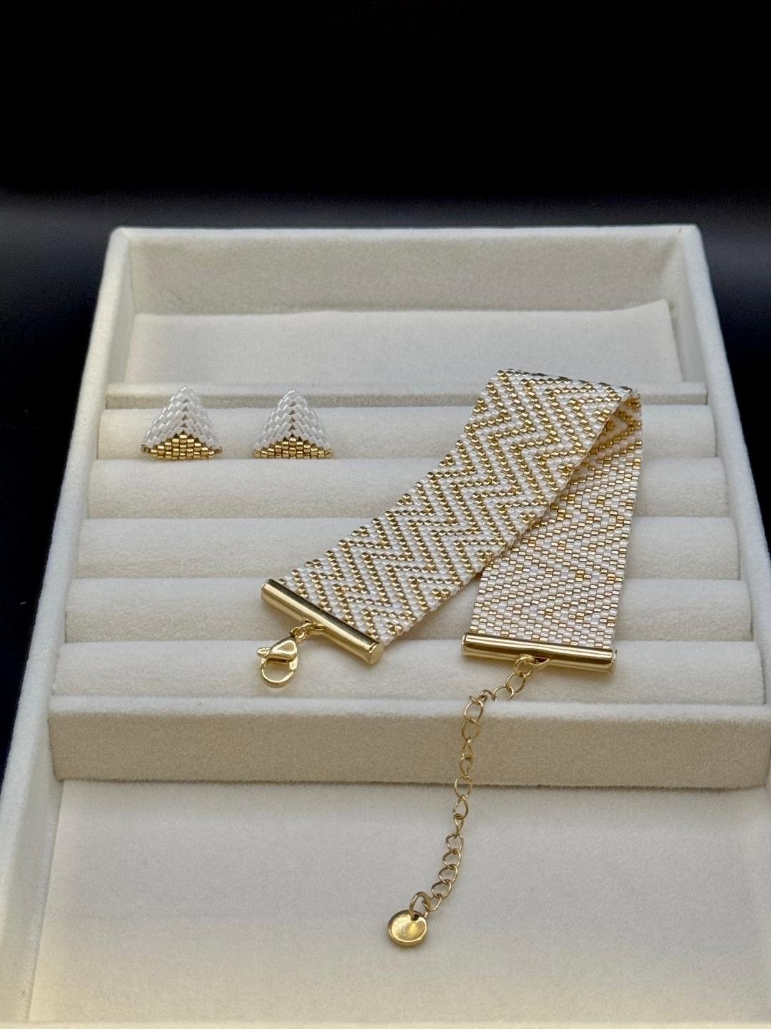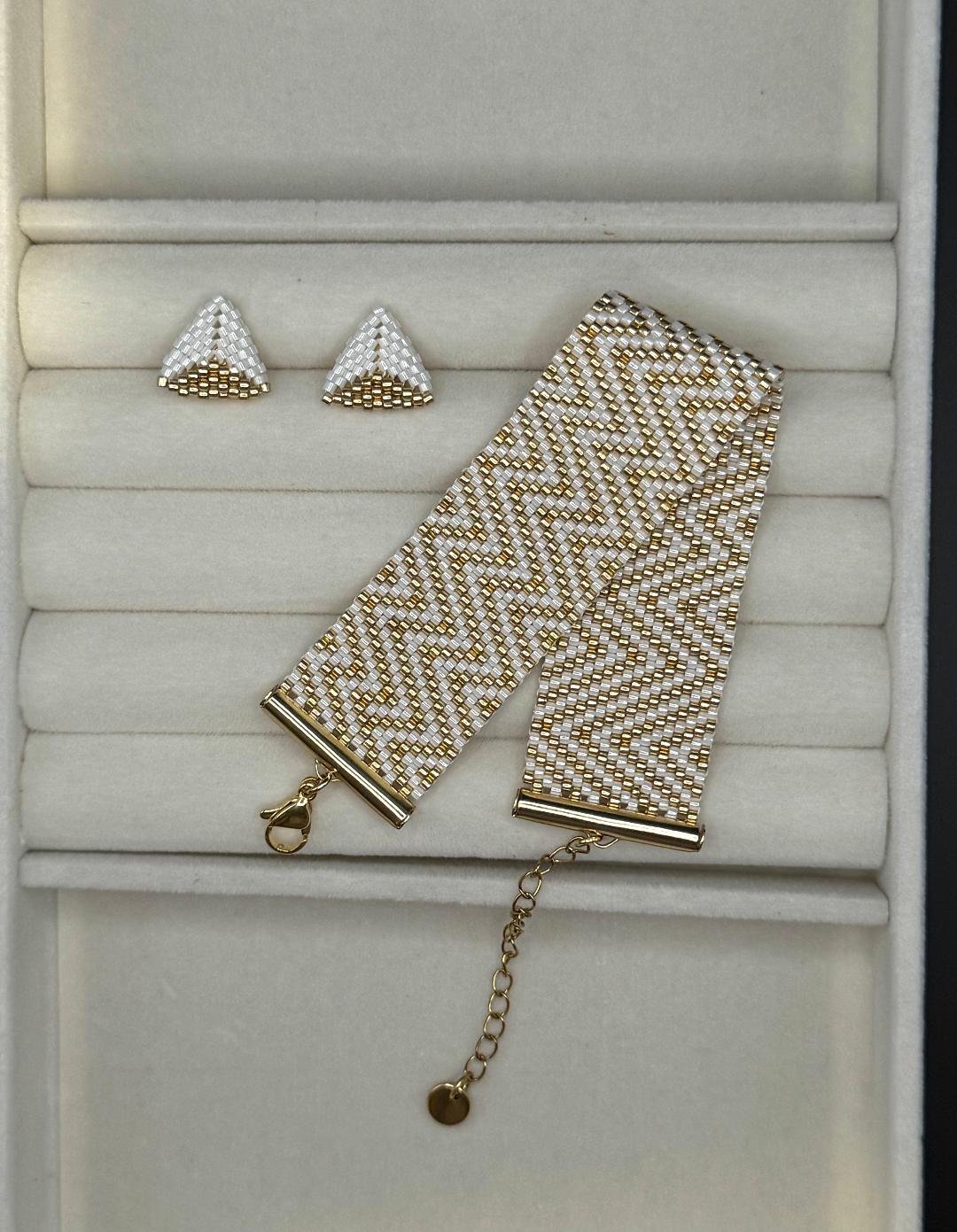 Brățara „Trinity Gold” este o piesă statement, realizată manual din mărgele fine, cu un model geometric sofisticat în nuanțe de alb și auriu. Designul său elegant reflectă echilibrul și rafinamentul, fiind ideal atât pentru ținute casual chic, cât și pentru apariții elegante.