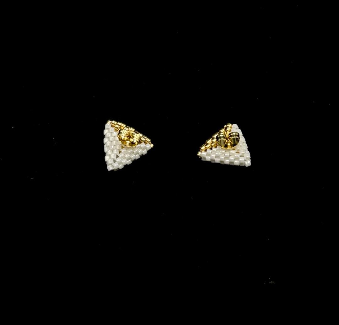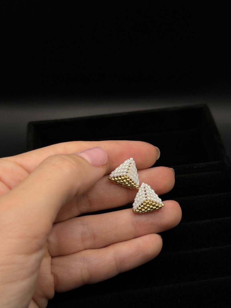 Cerceii „Trinity Gold” sunt creați manual din mărgele fine, într-un design geometric în formă de triunghi, care simbolizează echilibrul, eleganța și forța interioară. Combinația rafinată de alb și auriu oferă un efect vizual sofisticat, perfect pentru ținute minimaliste sau apariții elegante.
