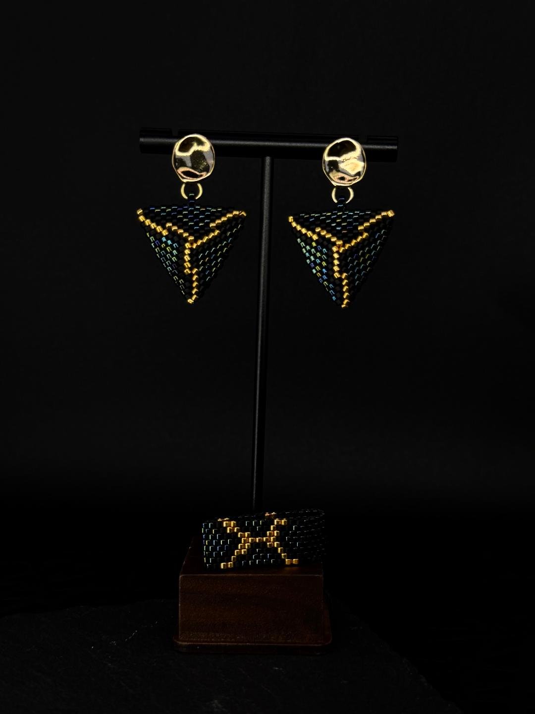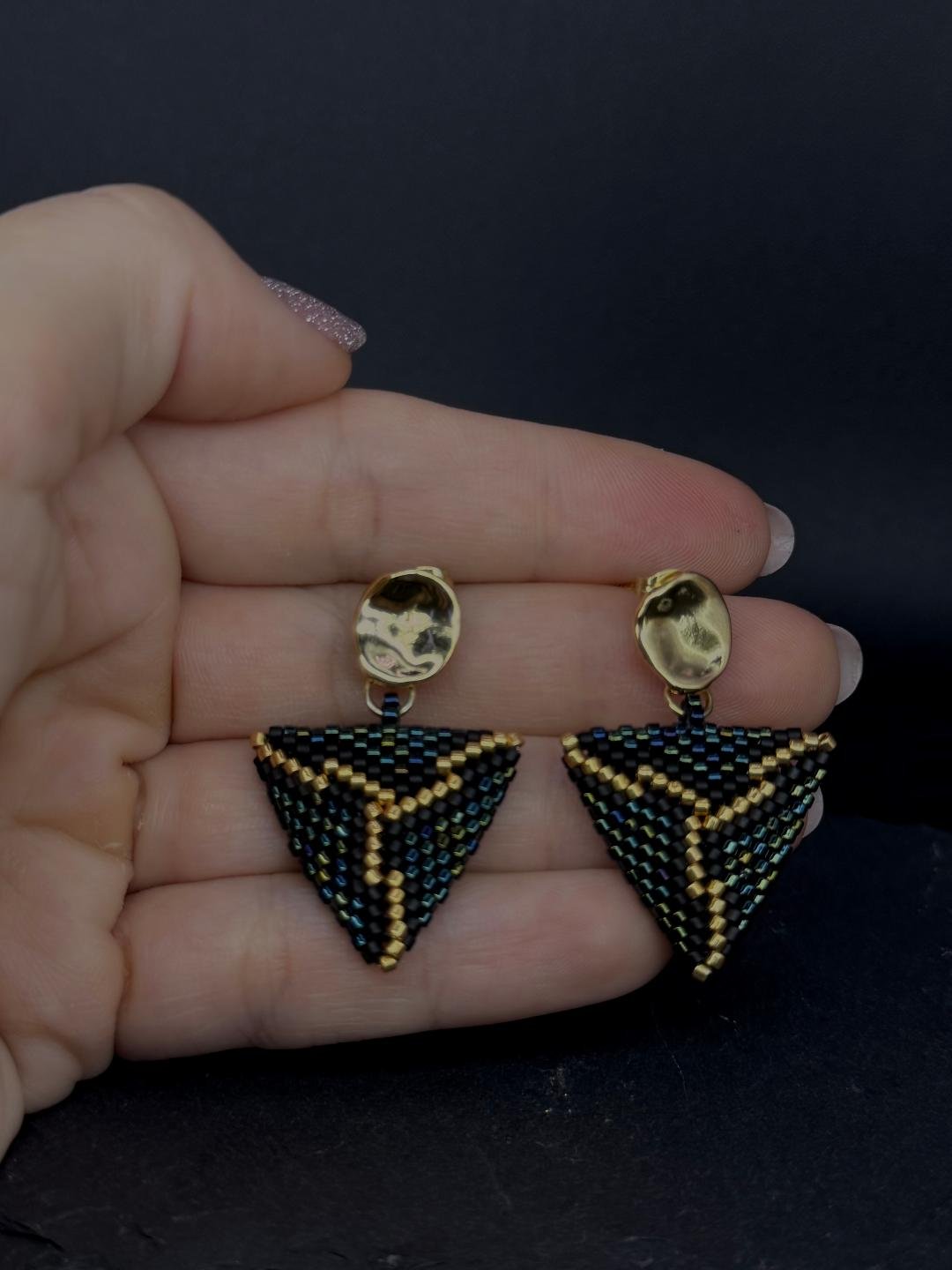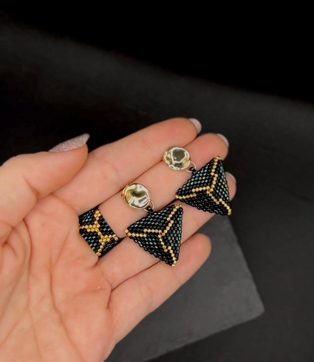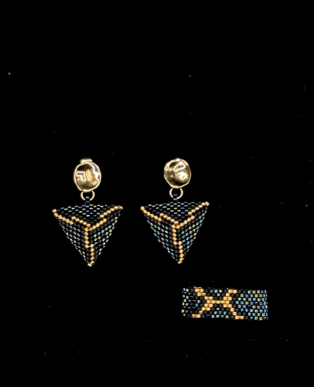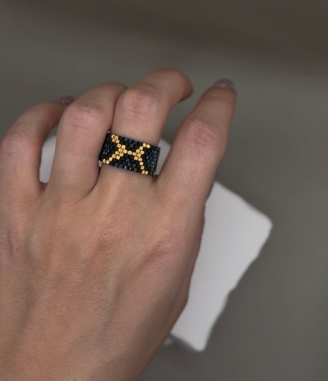 Inel statement realizat manual din mărgele fine, în nuanțe irizate de negru, verde petrol și auriu, cu un motiv geometric în formă de X care simbolizează echilibrul și forța interioară. Designul său sofisticat reflectă misterul nopții și strălucirea aurului, oferind un look modern și puternic.